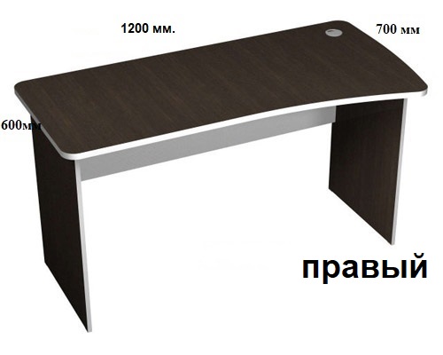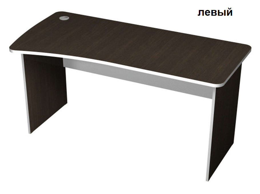 Столешница эргономичной формы с розеткой для проводов изготовлена из ЛДСП толщиной 22 мм., кромка защищена противоударным кантом ПВХ 2 мм. Углы скруглены. Опоры установлены на пластмассовые подпятники. В зависимости от нахождения розетки стол может быть правым или левым