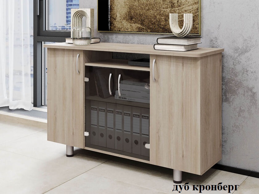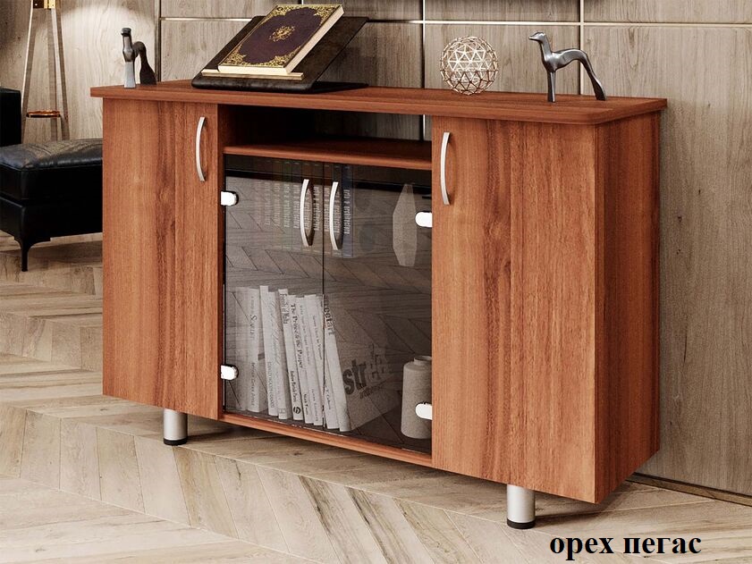 Тумба многофункциональная серии Лидер. Внешние углы топа скруглены. Опоры регулируются по высоте. Шкаф имеет в центре распашные дверцы из стекла и глухие двери по краям, за которыми расположены полки. Стеклянные дверцы визуально расширяют пространство кабинета. Тонированное стекло добавляет интерьеру выразительность. Корпус тумбы выполнен из ЛДСП толщиной 22 и 16 мм. повышенной прочности, торцы всех деталей обработаны ПВХ кромкой. Металлические ручки с матовой серебристой поверхностью идеально гармонируют с мебелью подчёркивая её стиль и надёжность. Опоры регулируются по высоте.
