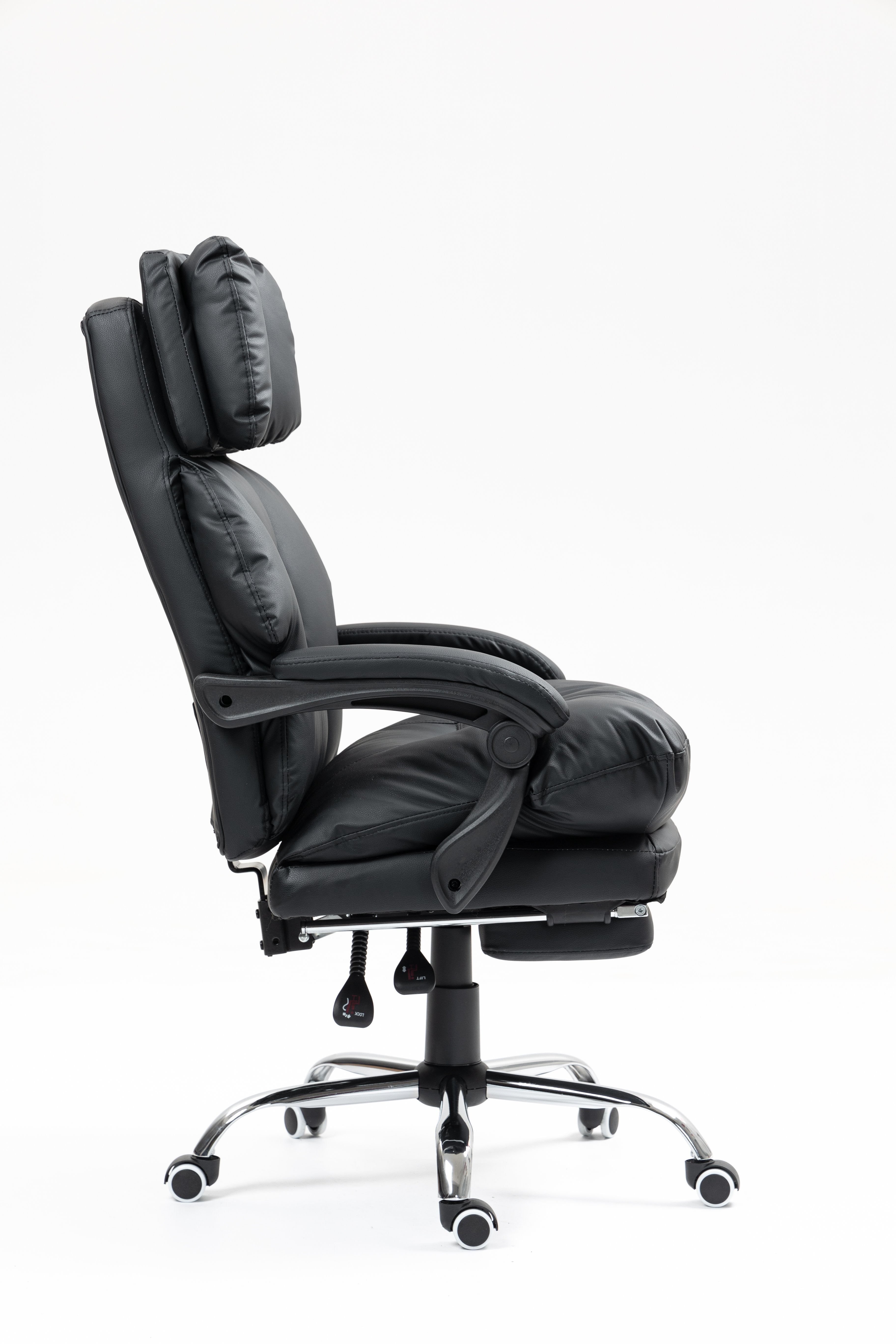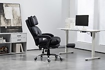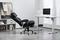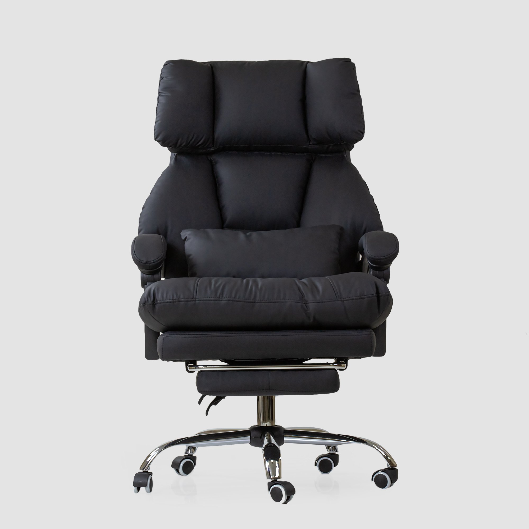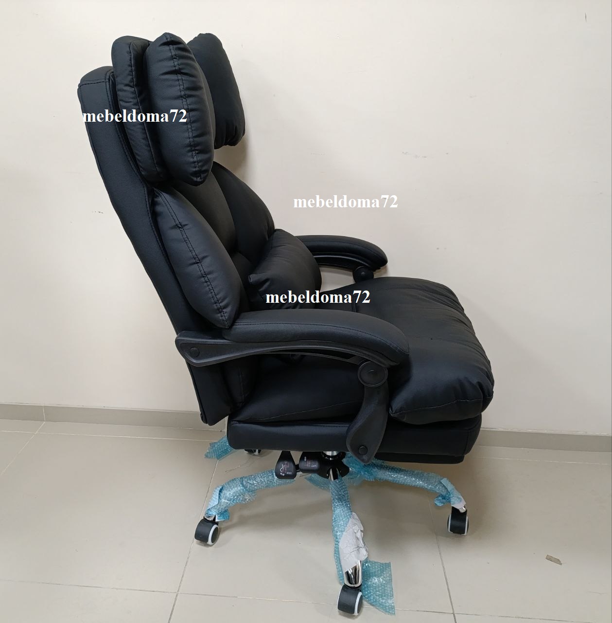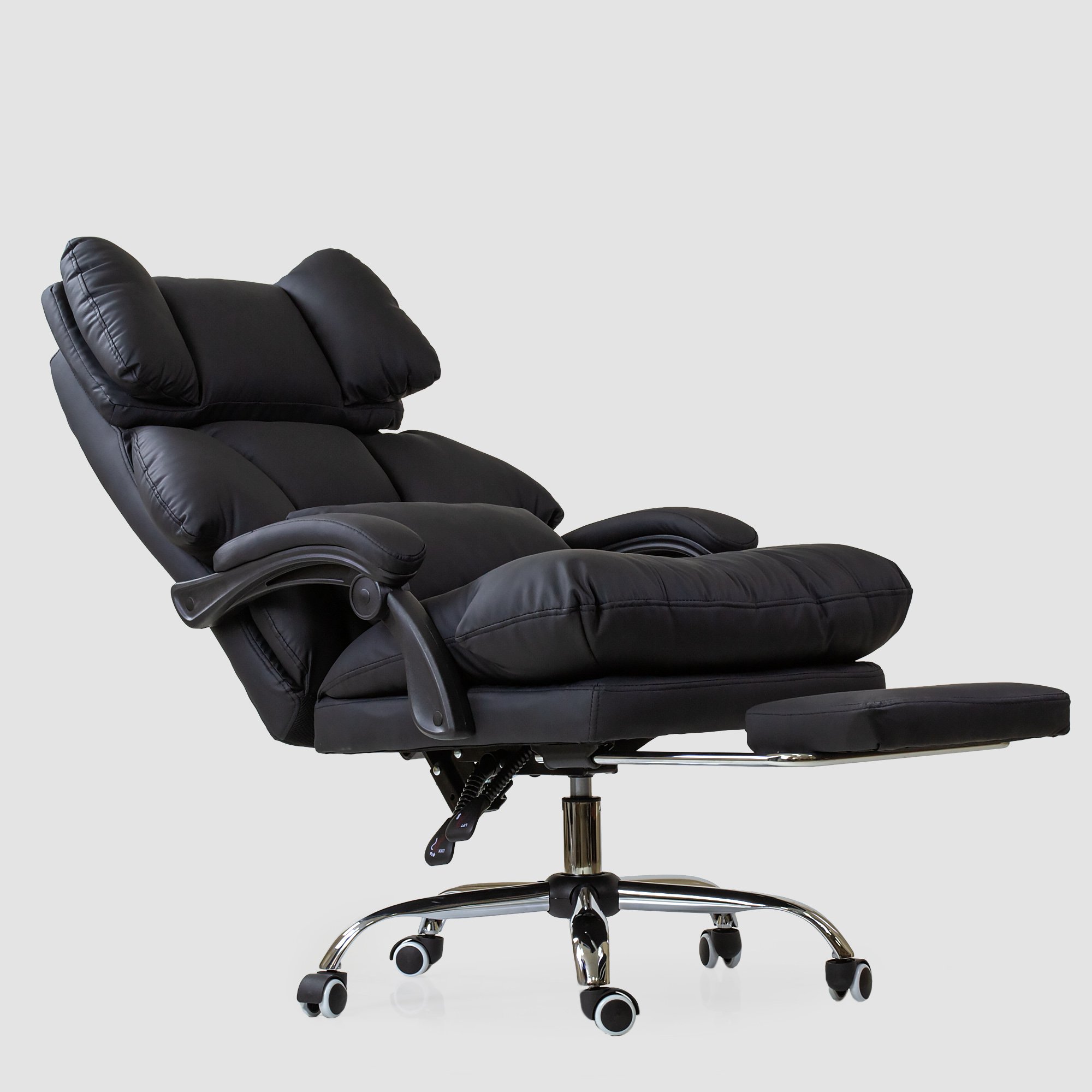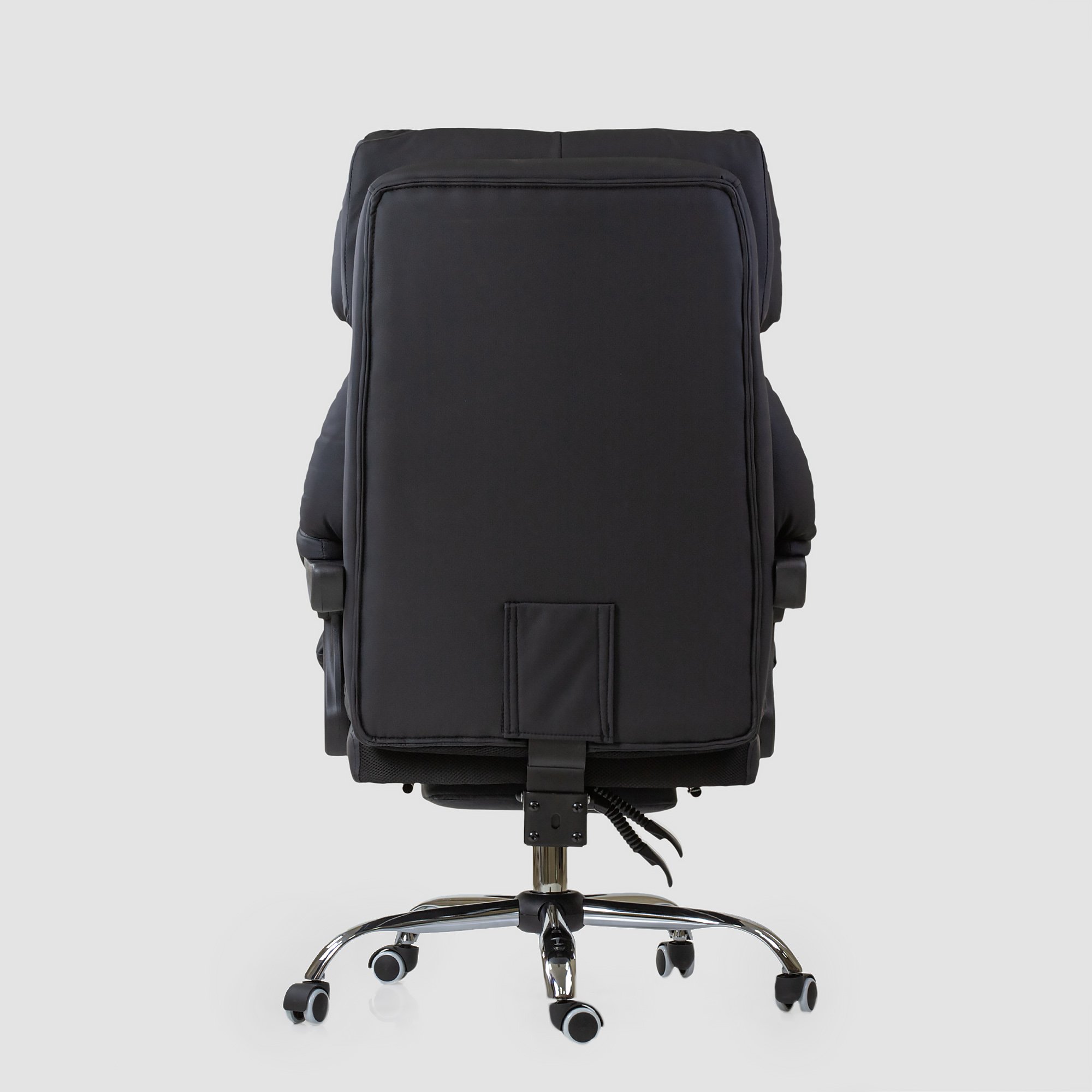 Солидное кресло руководителя оснащено выдвижной подножкой и подушкой свободного размещения. Кресло имеет поворотно-подъёмный механизм газ-лифт и механизм регулировки наклона спинки. Мягкие подлокотники нерегулируемые, подвижные. Высота сиденья от пола 450-510 мм. Высота спинки 710 мм. Размеры сиденья внутренние 530х510 мм. Крестовина металлическая имеет диаметр 700 мм., ролкики нейлон прорезиненные для ламината и паркета