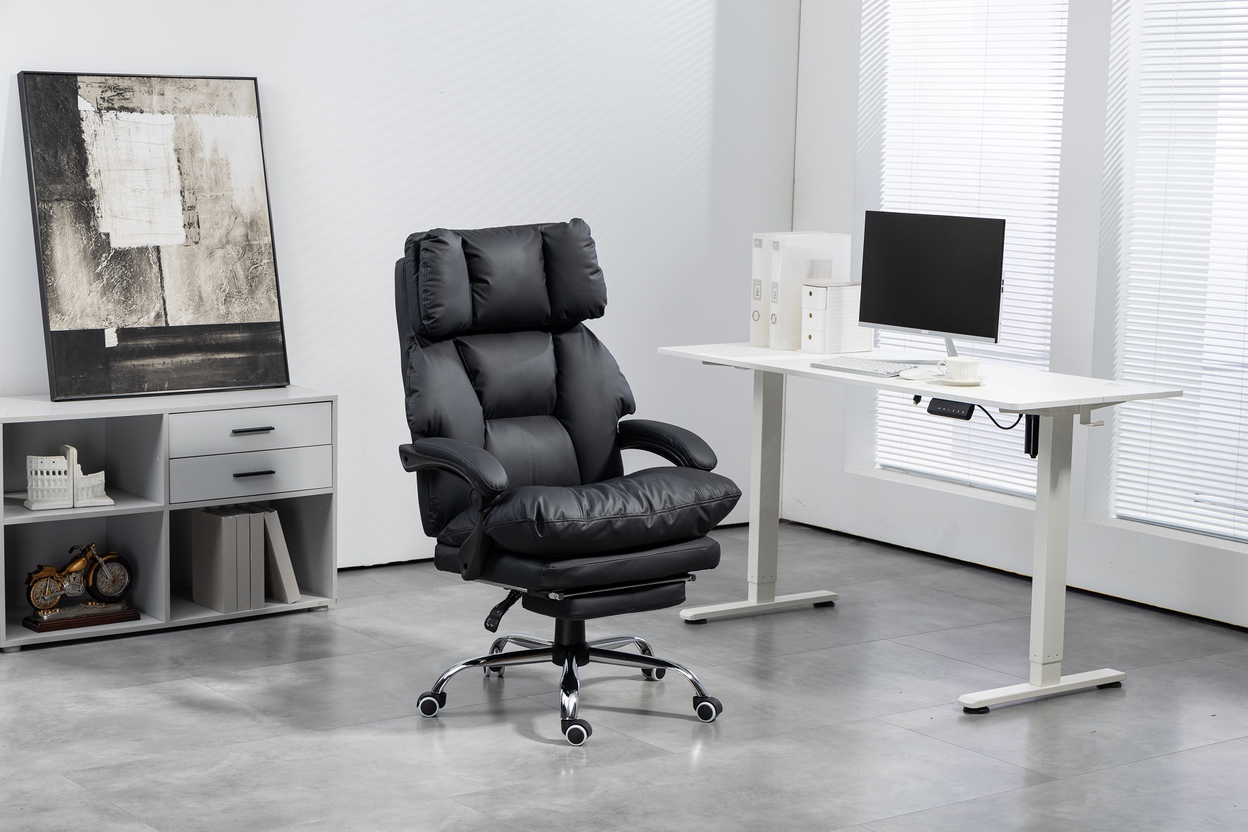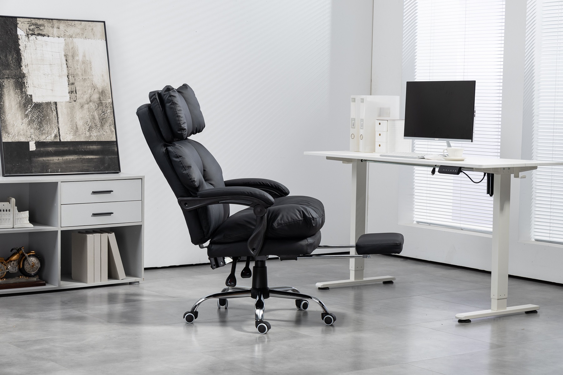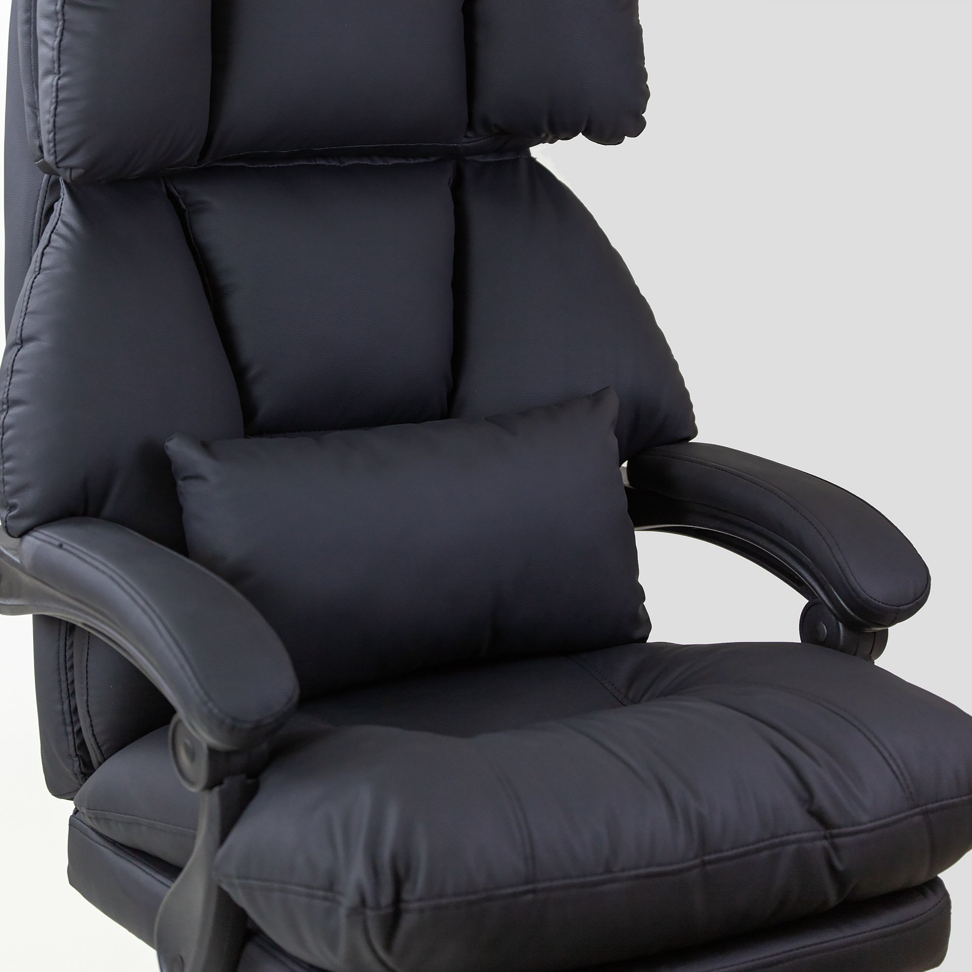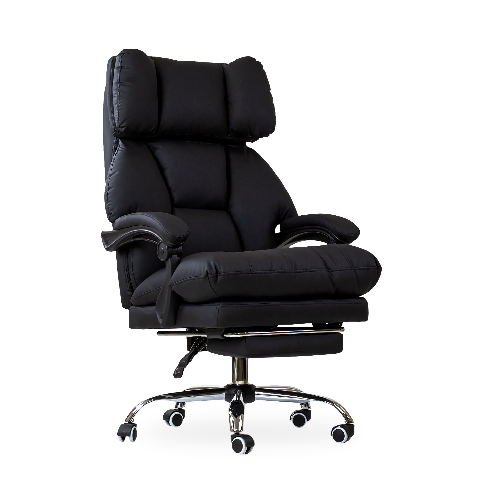 Солидное кресло руководителя оснащено выдвижной подножкой и подушкой свободного размещения. Кресло имеет поворотно-подъёмный механизм газ-лифт и механизм регулировки наклона спинки. Мягкие подлокотники нерегулируемые, подвижные. Высота сиденья от пола 450-510 мм. Высота спинки 710 мм. Размеры сиденья внутренние 530х510 мм. Крестовина металлическая имеет диаметр 700 мм., ролкики нейлон прорезиненные для ламината и паркета