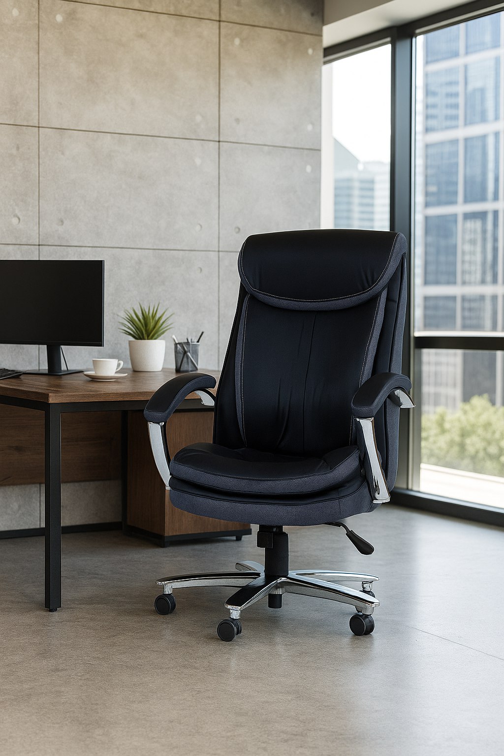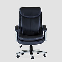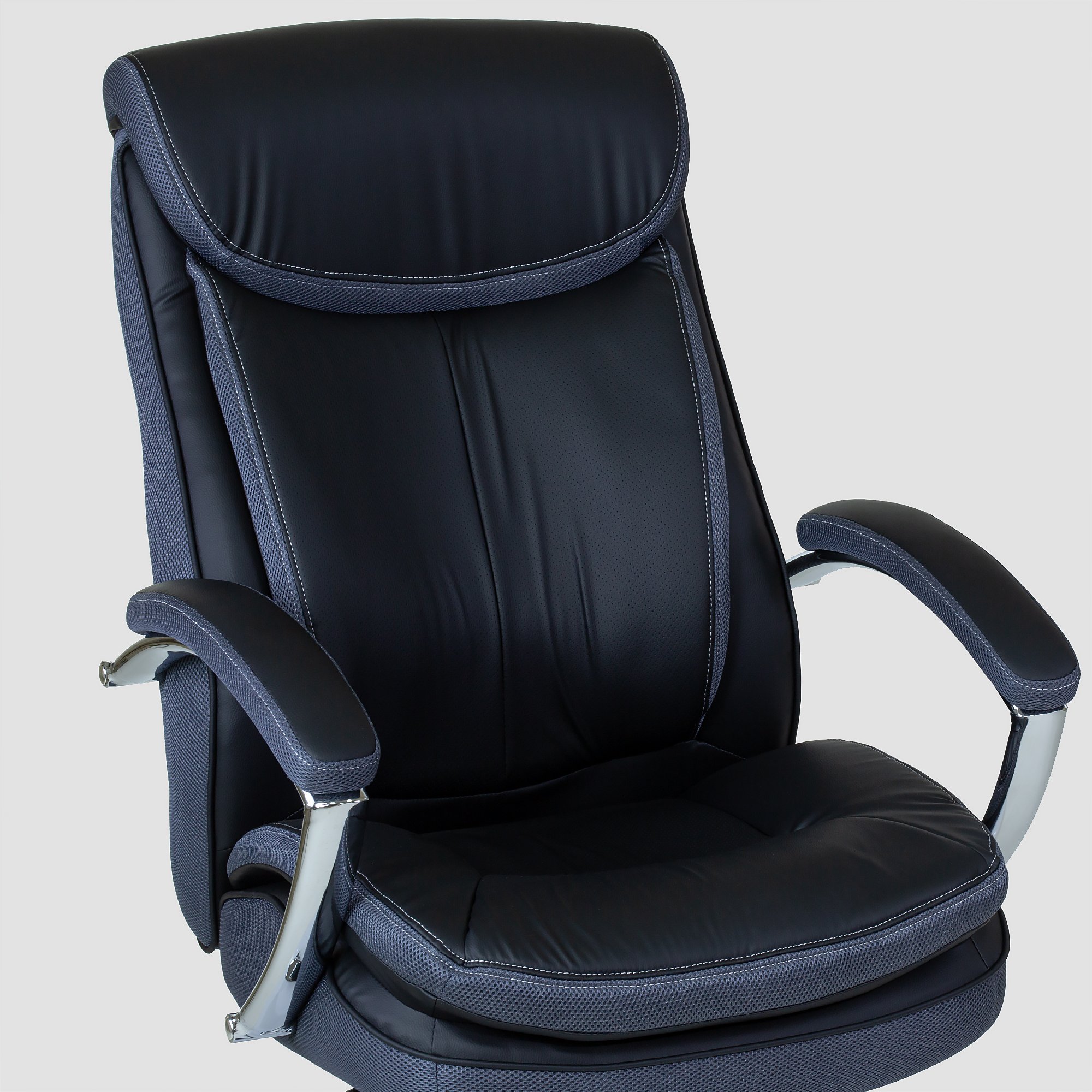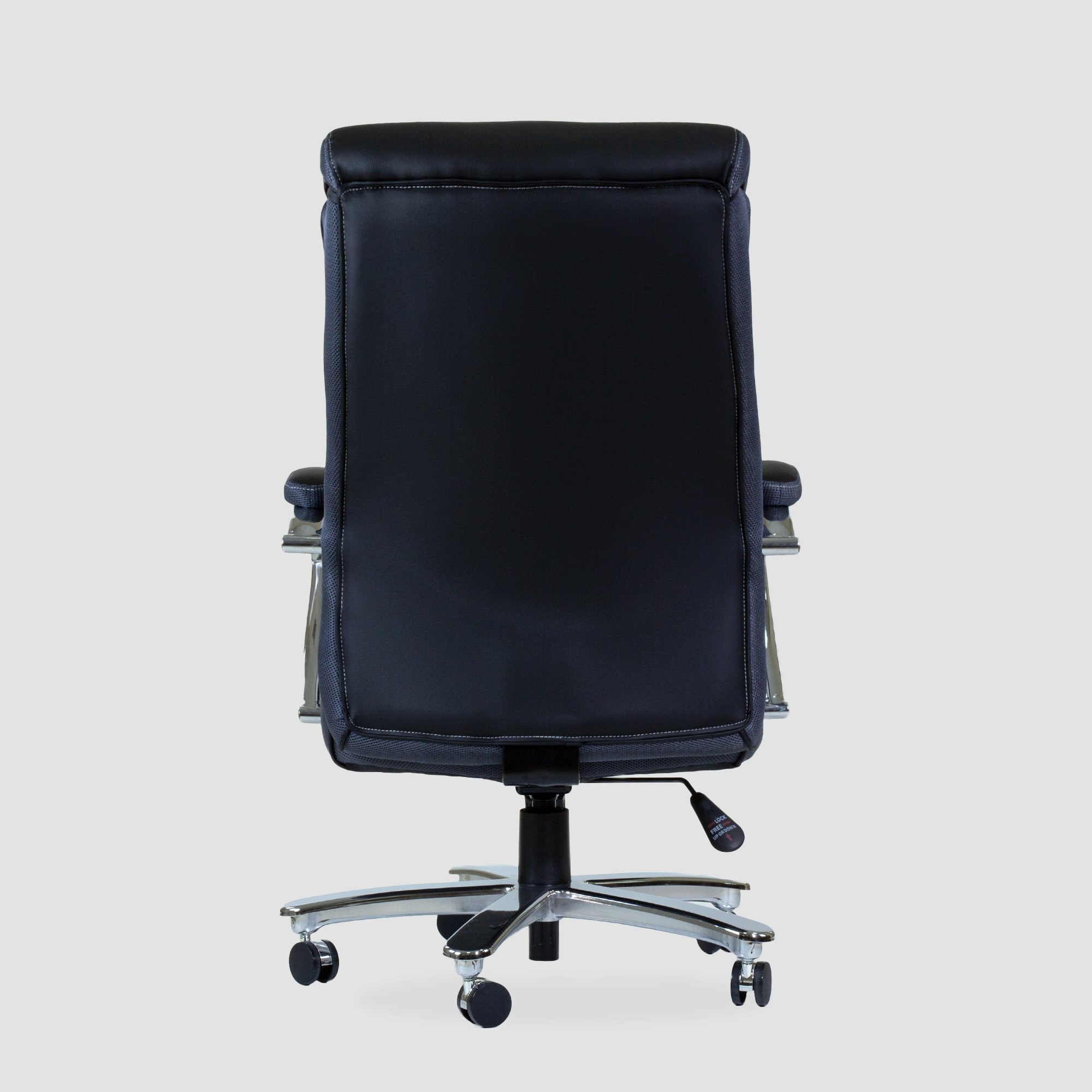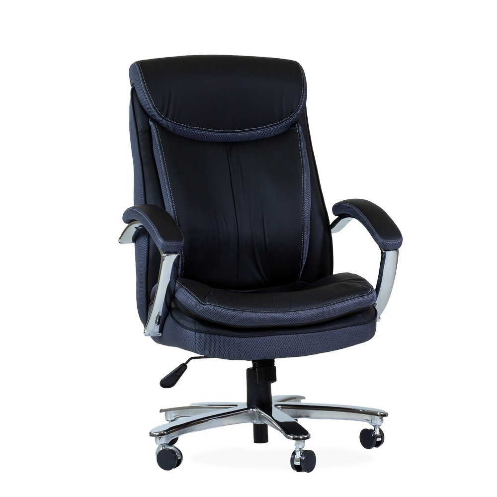 Кресло офисное для руководителя К-307 BIG SIZE XXL снабжено поворотно-подъёмным механизмом газ-лифт и механизмом качания топ-ган с фиксацией в одном положении. Нерегулируемые подлокотники с накладками из экокожи. Широкое сидение имеет размеры 570-520 мм. Высота спинки 750 мм., высота сиденья от пола 490-580 мм. Ролики нейлон диаметром 50 мм.