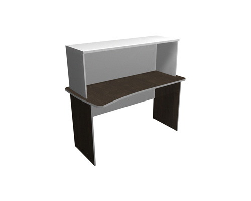 Эргономичный компьютерный стол с надстройкой. Столешница эргономичной формы, углы скруглены. Имеется розетка для кабеля. Надстройка крепится к столу. В зависимости от расположения розетки стол может быть правым или левым.