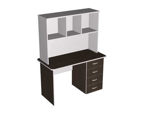 Компьютерный стол с надстройкой состоит из 2-х модулей. Стол имеет 4 выдвижных ящика на роликовых направляющих для канцелярии, столешница с розеткой для кабеля. В зависимости от расположения розетки тол может быть правым или левым. Встроенная тумба расположена с противоположной от розетки стороны.