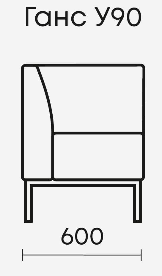 Модуль угловой Ганс У90 прекрасно сочетается с другими модулями серии офисной мебели Ганс. Мебель изготовлена из ДВП толщиной 3,2 мм., бруска из древесины хвойных пород толщиной 25 мм. и фанеры берёзовой 3 мм.Каркас состоит из спинки, сидения и металлического каркаса. Сидение крепится к спинке на с аморезы. Сидение и спинка устанавливаются на металлический каркас и крепится саморезами. На сидении используется ППУ марки ST-2536 на сидении 50, на спинке ST-2236 30 и 20 мм. Металлический каркас из трубы квадратного сечения 20х20 мм. окрашен в серый или чёрный цвет полимерно-порошковой краской.