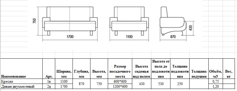 - размеры посадочного места дивана 1200х600 мм.;