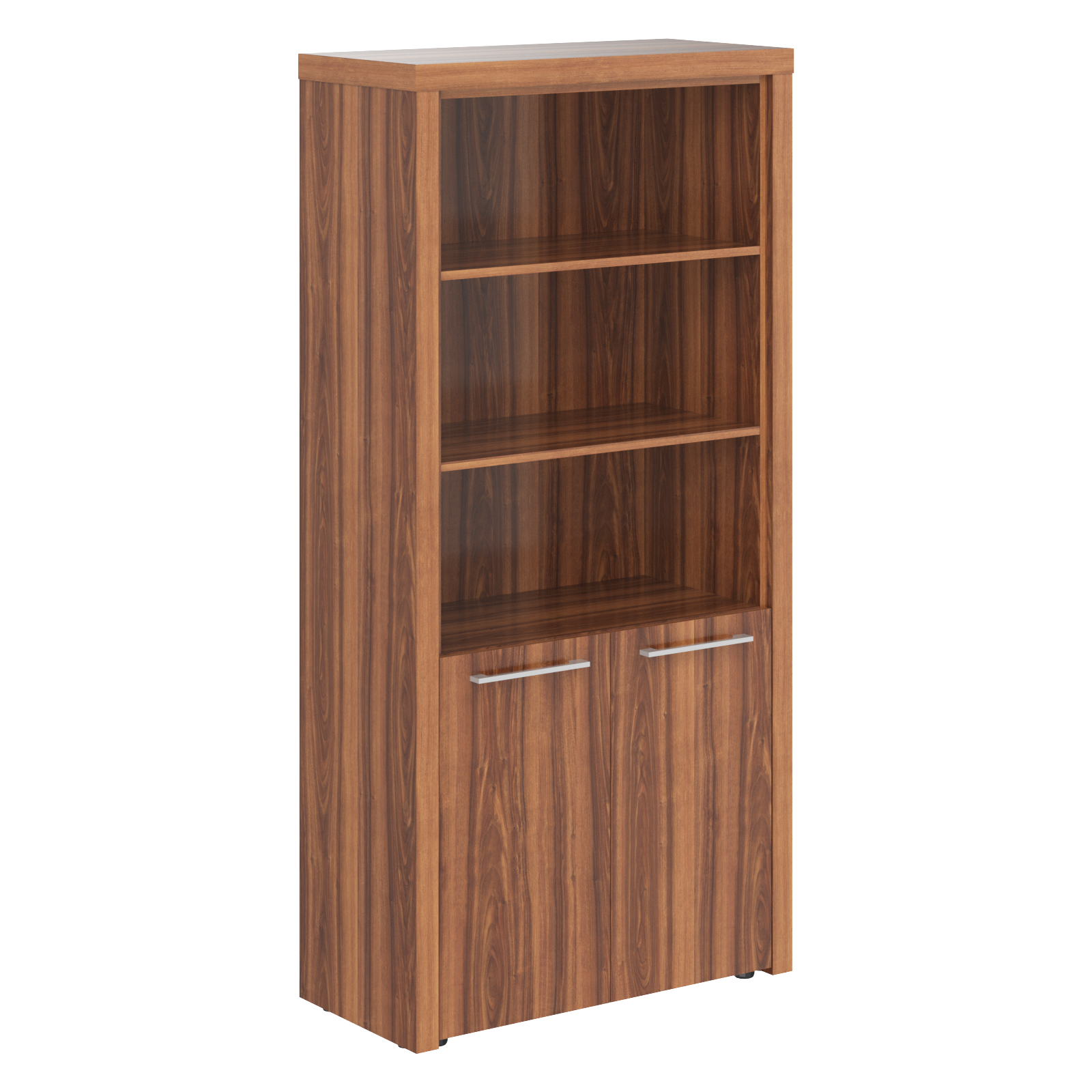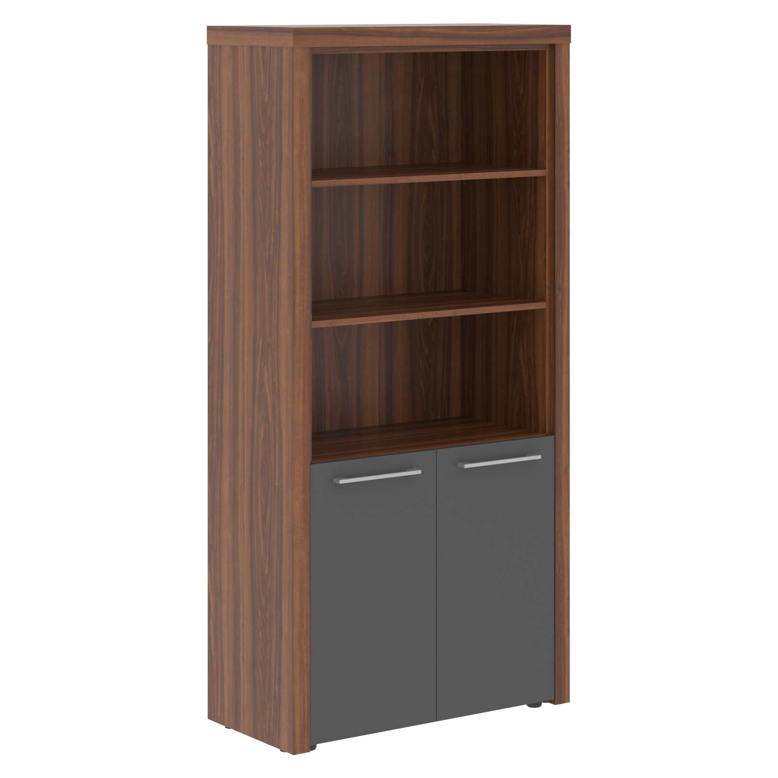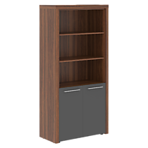 Шкаф полуоткрытый ZHC 85.5 серии ZENN. Шкаф состоит из открытых полок и закрытой секции. На полках свободно размещаются офисные папки стандартного формата.