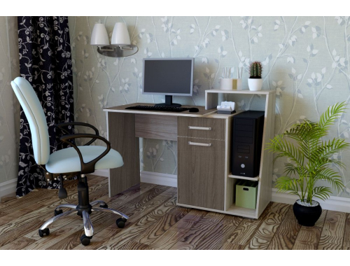 Компьютерный стол СК-03 имеет встроенную тумбы с 1 выдвижным ящиком, за распашной дверкой расположено отделение разделённое полкой. На боковой полке можно разместить системный блок или поставить папки, книги. Компьютерный стол имеет достаточно небольшие размеры и может стоять в небольших комнатах.