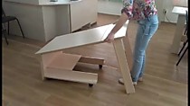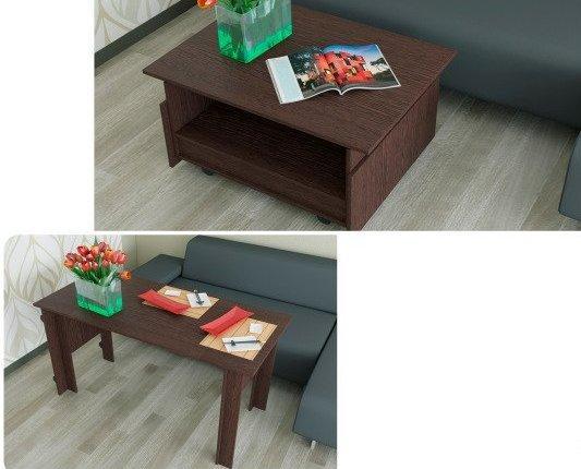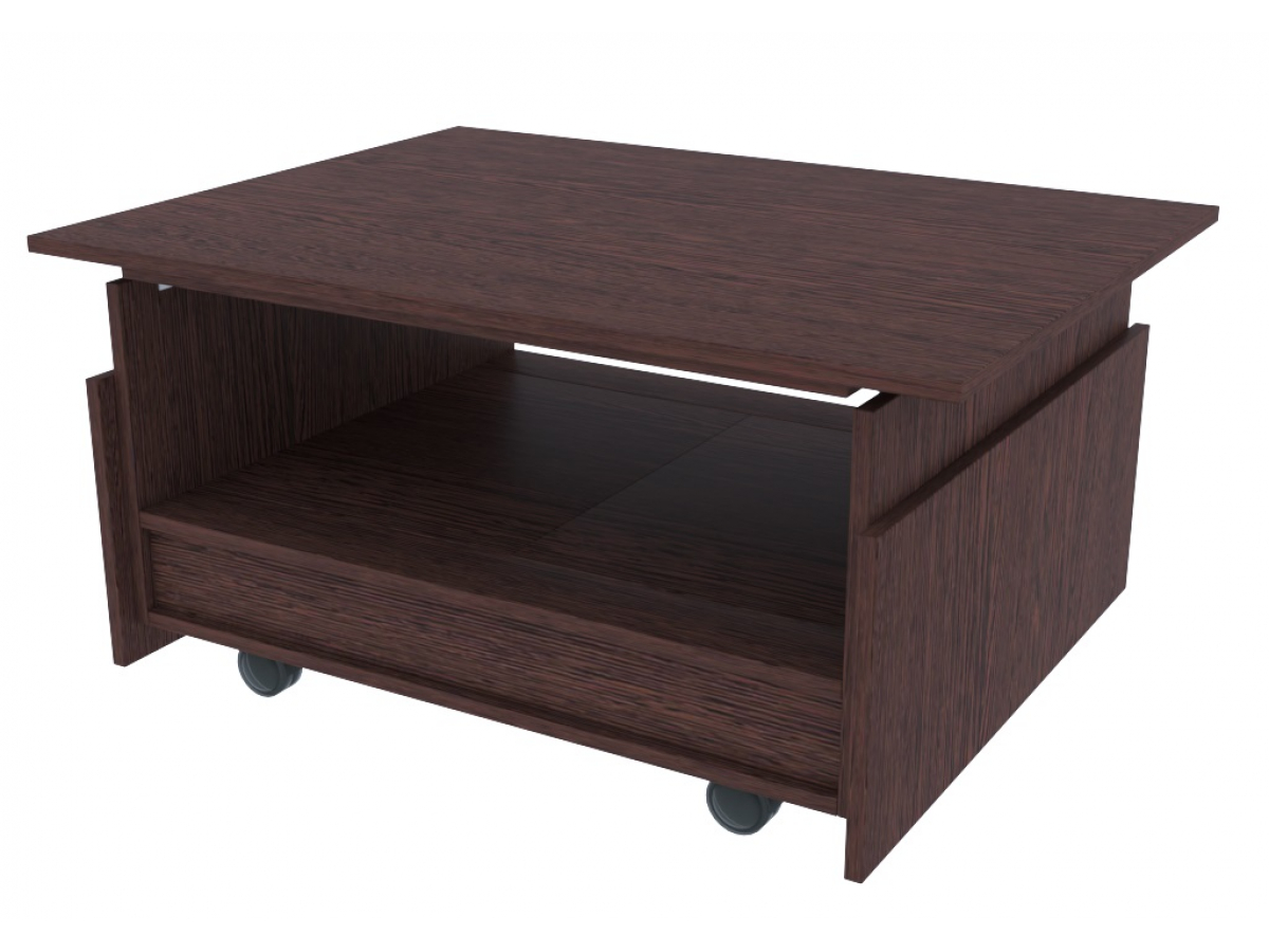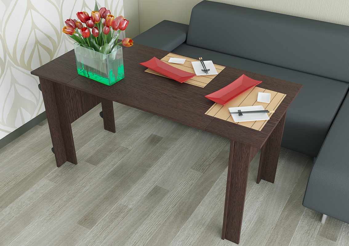 Журнальный стол-трансформер Оригами. В сложенном виде стол имеет открытую нишу. Стол имеет колёсные опоры.