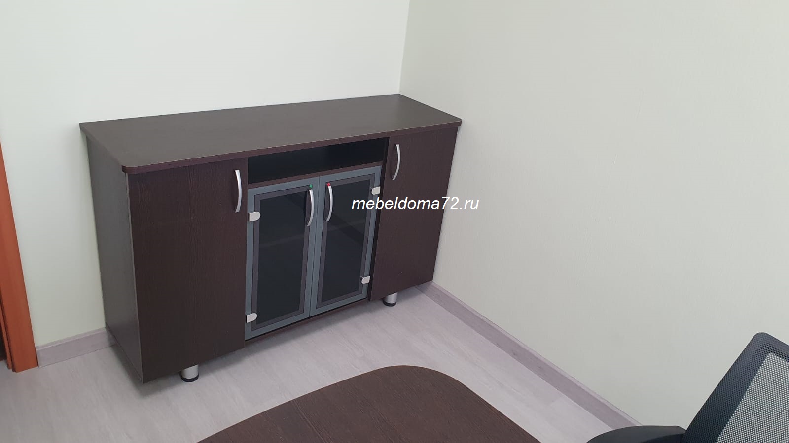 Многофункциональная тумба 83.22 в благородном тёмно-коричневом цвете Венге с древесной структурой. Тумбу можно использовать дома или в офисном помещении. На широкую поверхность можно поставить телевизор. Тумба имеет высокие металлические опоры. На стеклянных дверях серый рисунок.