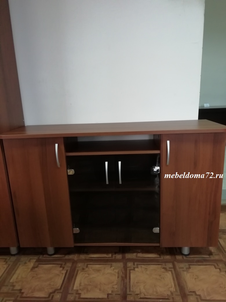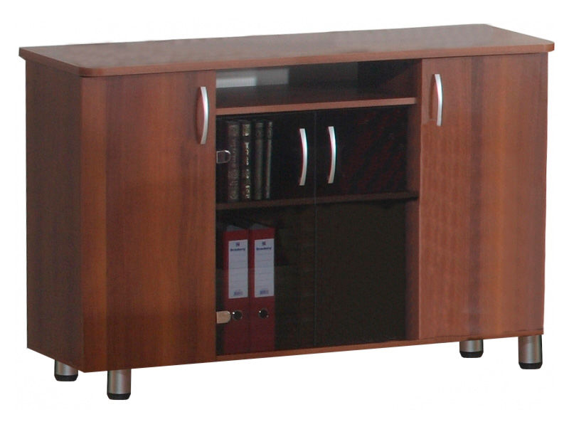 Тумба офисная на регулируемых опорах. Две распашные дверцы из ЛДСП, за которыми расположено по одной полке. В центре двери из тонированного стекла. Опоры тумба регулируются по высоте. Топ тумбы имеет скруглённые углы. Тумба продаётся отдельно и в составе кабинета руководителя Лидер