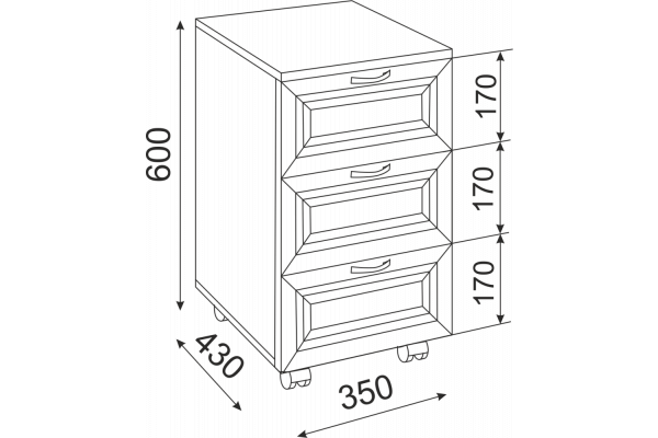 Тумба подкатная имеет 3 выдвижных ящика на шариковых направляющих полного выдвижения.